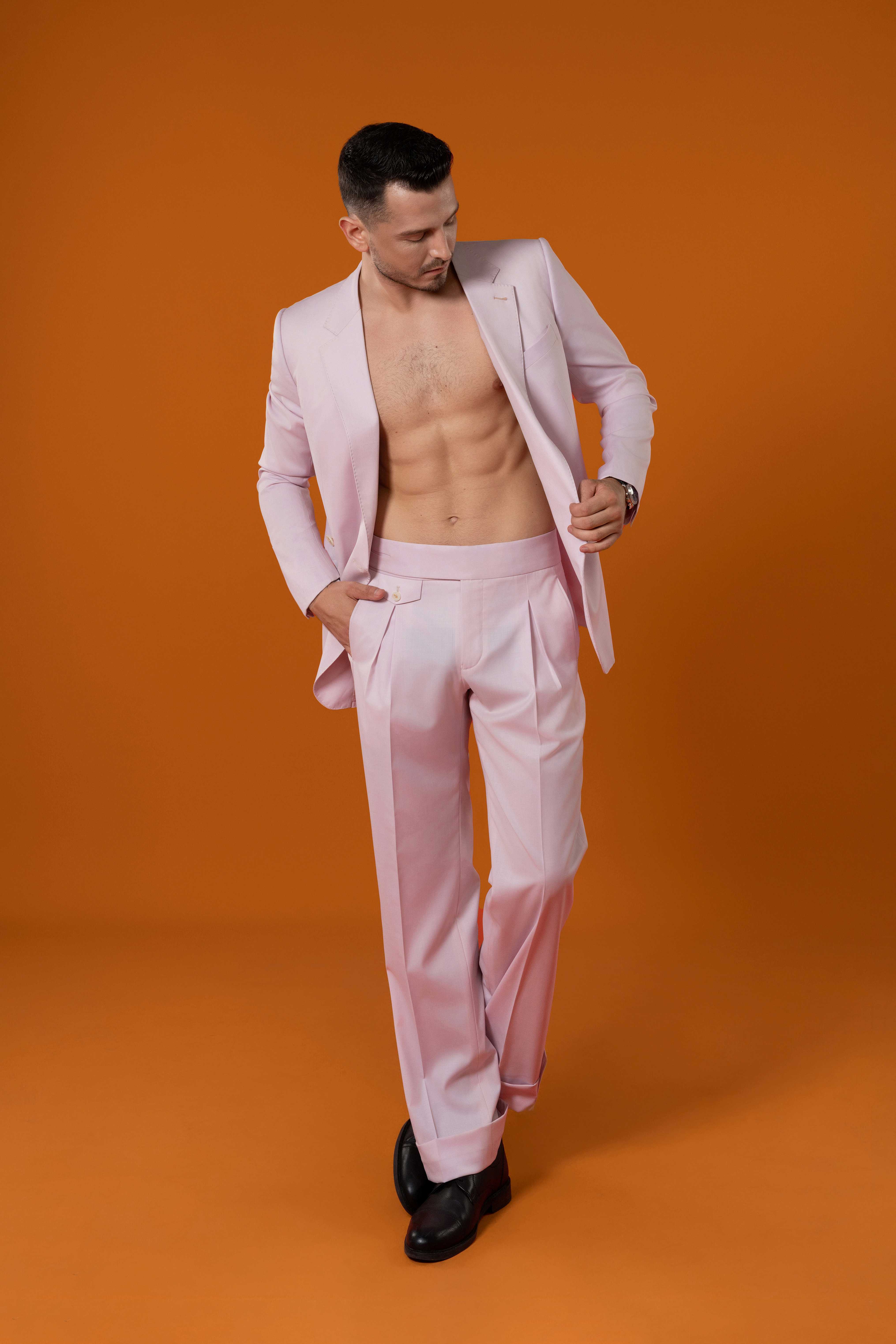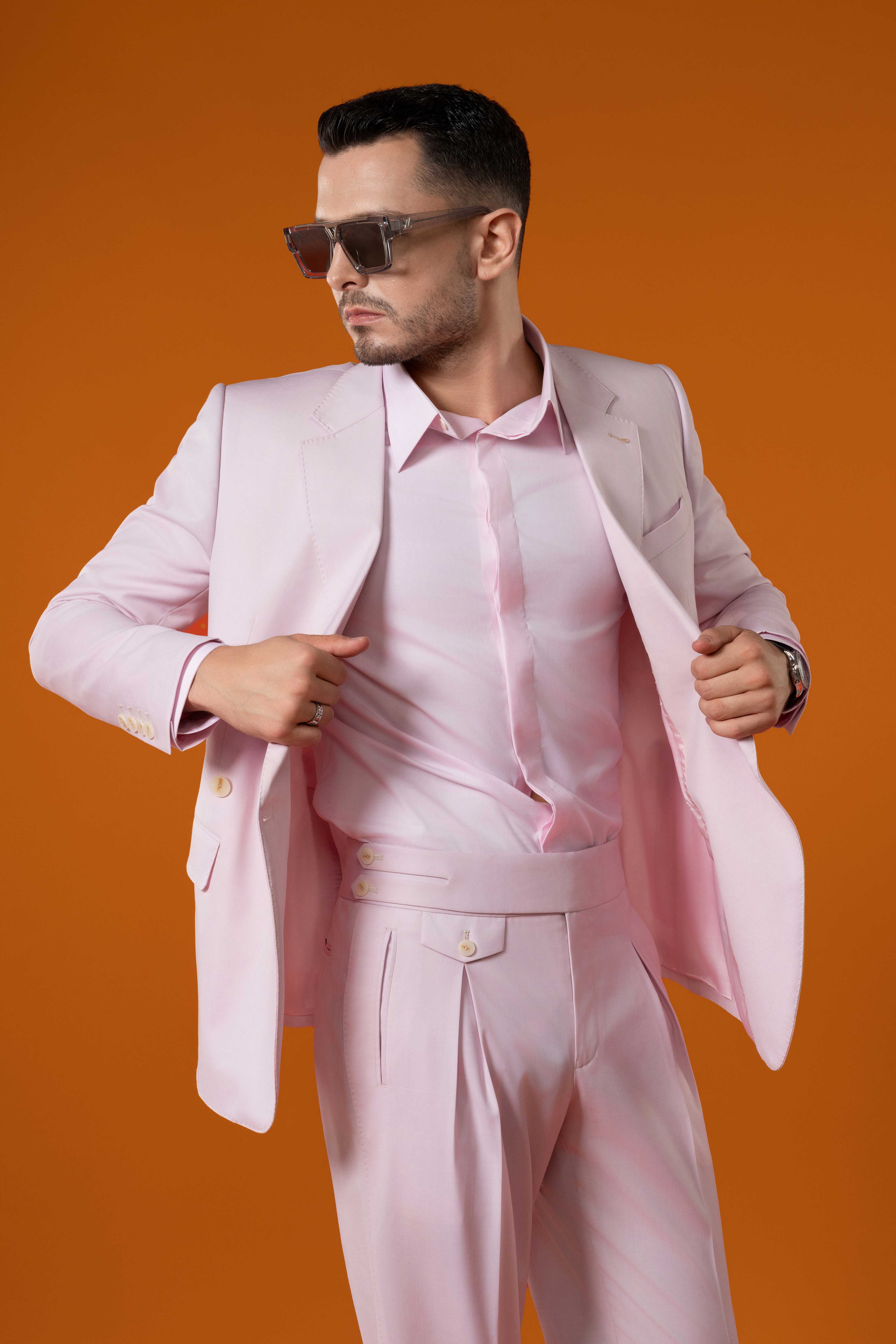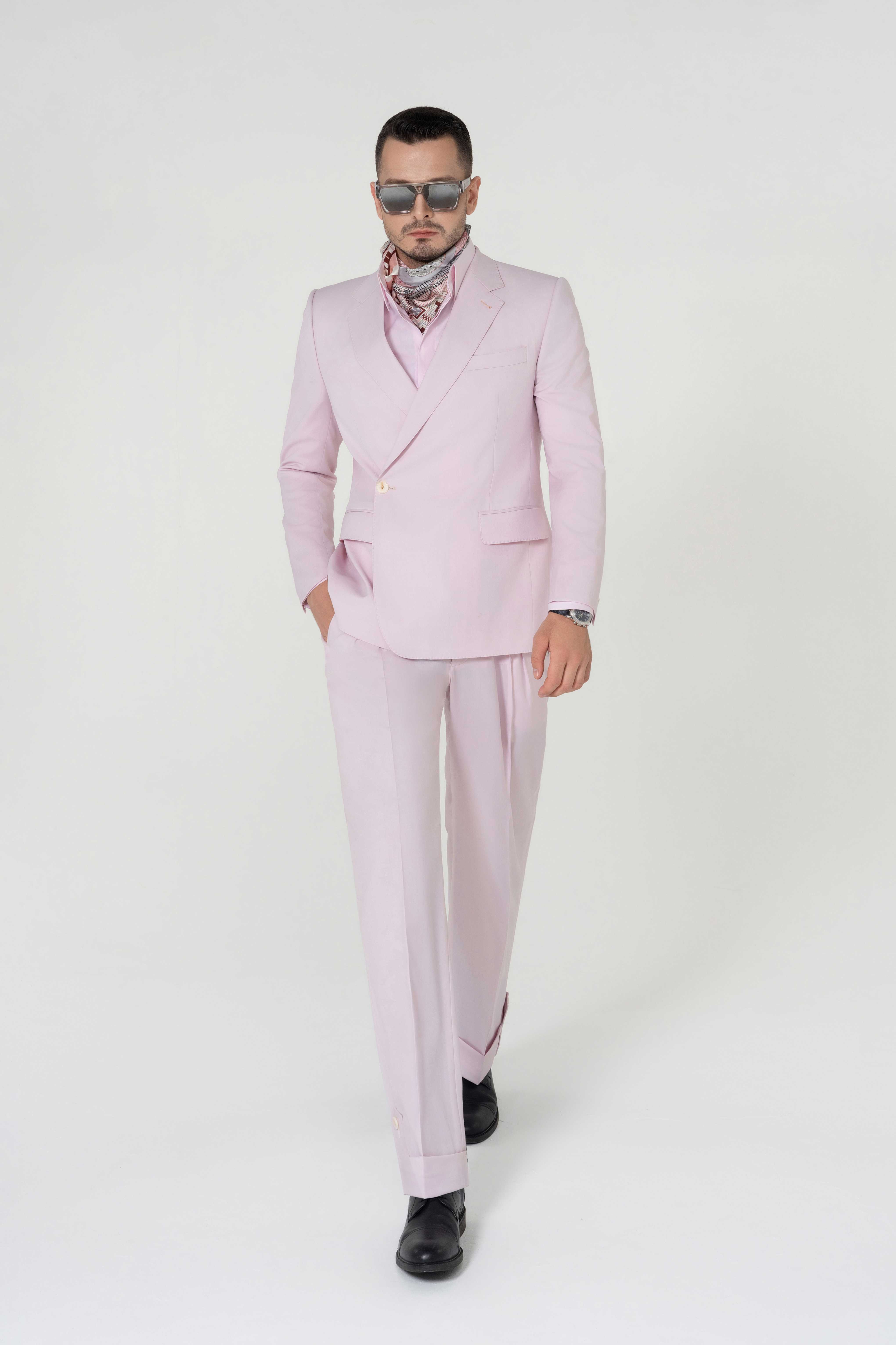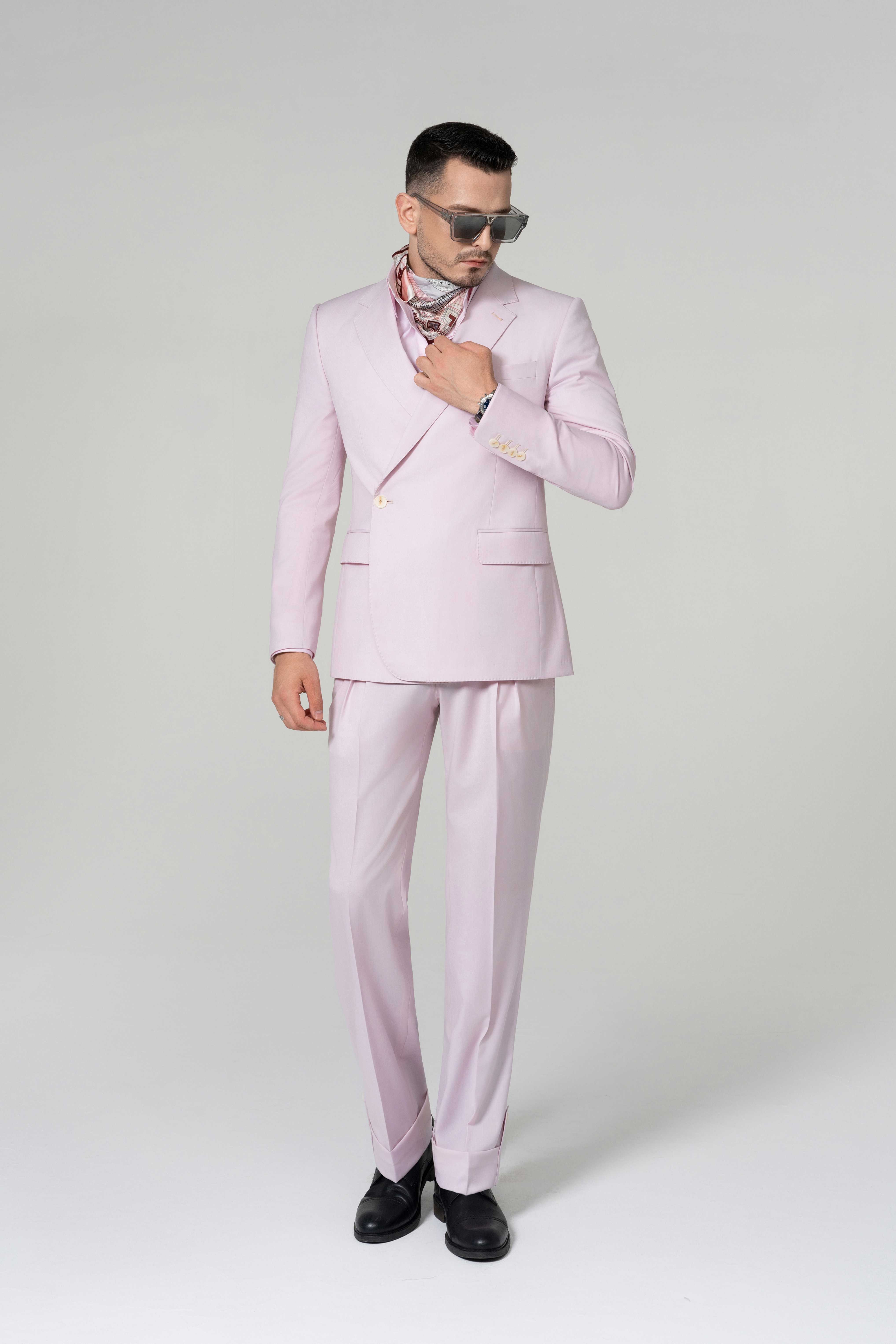 - Chi tiết: Bộ vest màu hồng pastel thể hiện sự tinh tế hiện đại pha chút nghệ thuật, rất phù hợp cho các dịp mùa xuân và mùa hè. Áo khoác hai hàng cúc mang lại phom dáng gọn gàng và sang trọng, tôn lên phong thái thanh lịch của người mặc. Gam hồng nhẹ nhàng toát lên sự tươi mới và tự tin, tạo nên điểm nhấn táo bạo nhưng vẫn tinh tế. Khăn lụa họa tiết làm tăng thêm nét sang trọng và cá tính riêng. Khi kết hợp cùng kính râm tối màu và giày da đen, tổng thể bộ trang phục thể hiện vẻ cuốn hút và đẳng cấp của quý ông hiện đại.