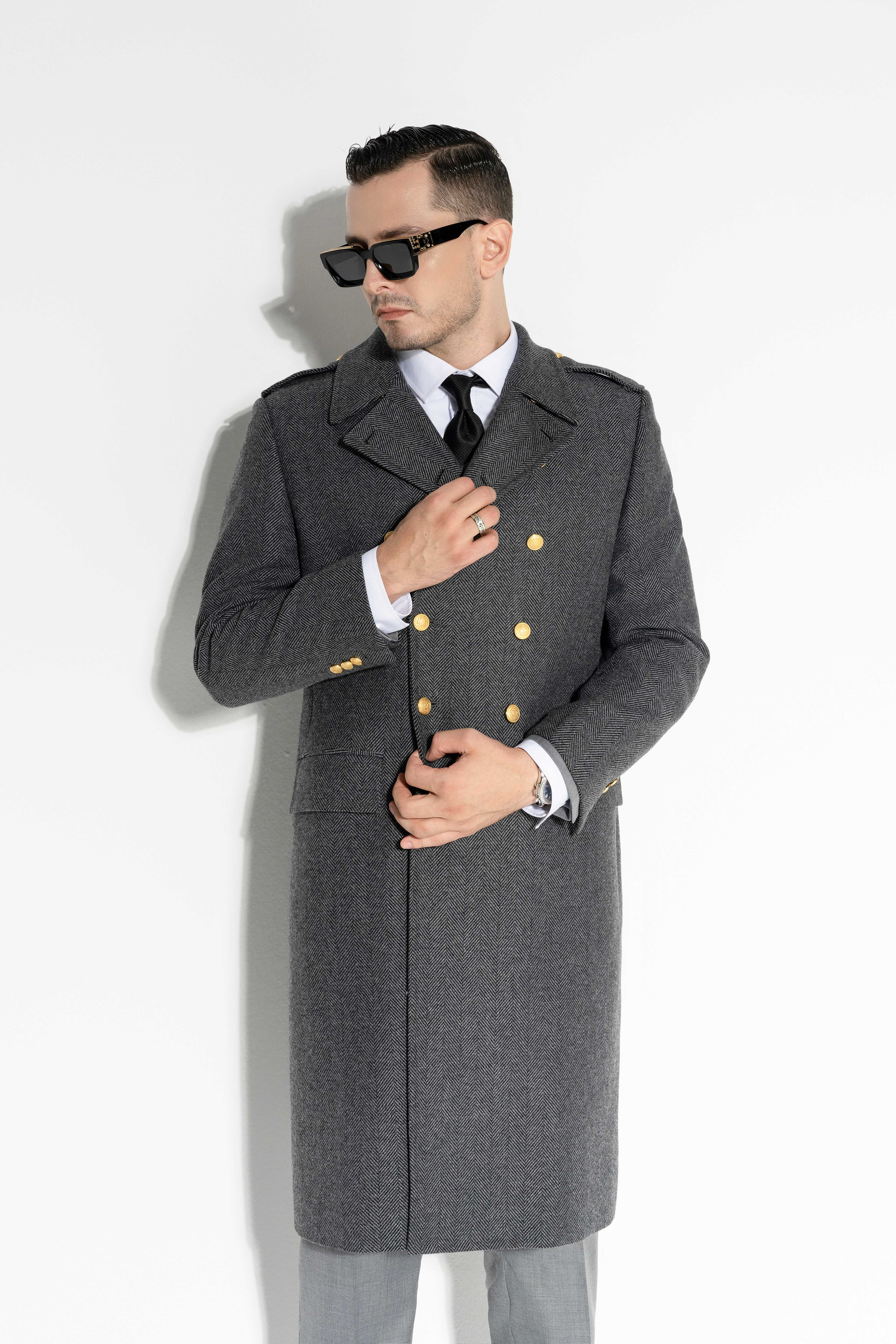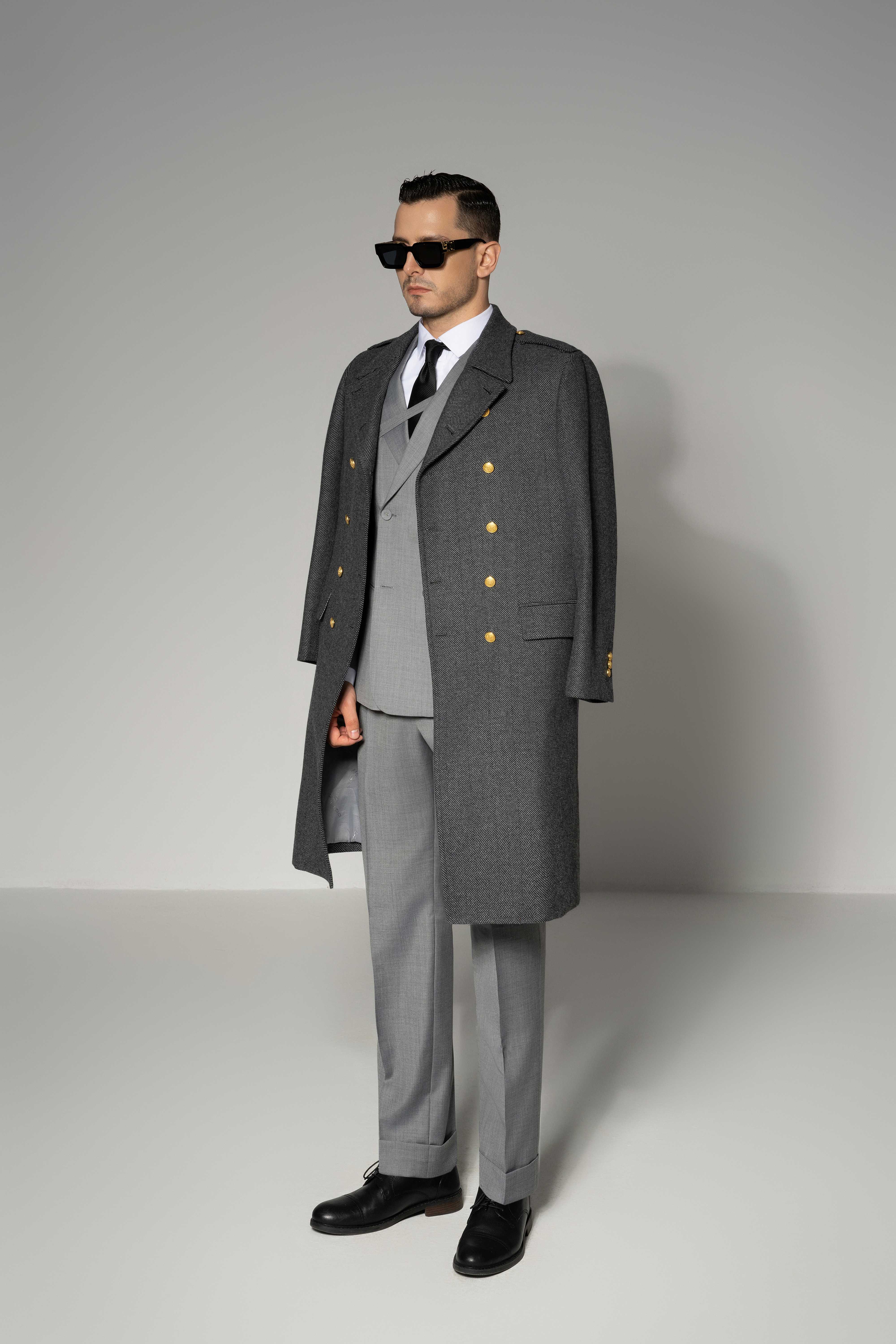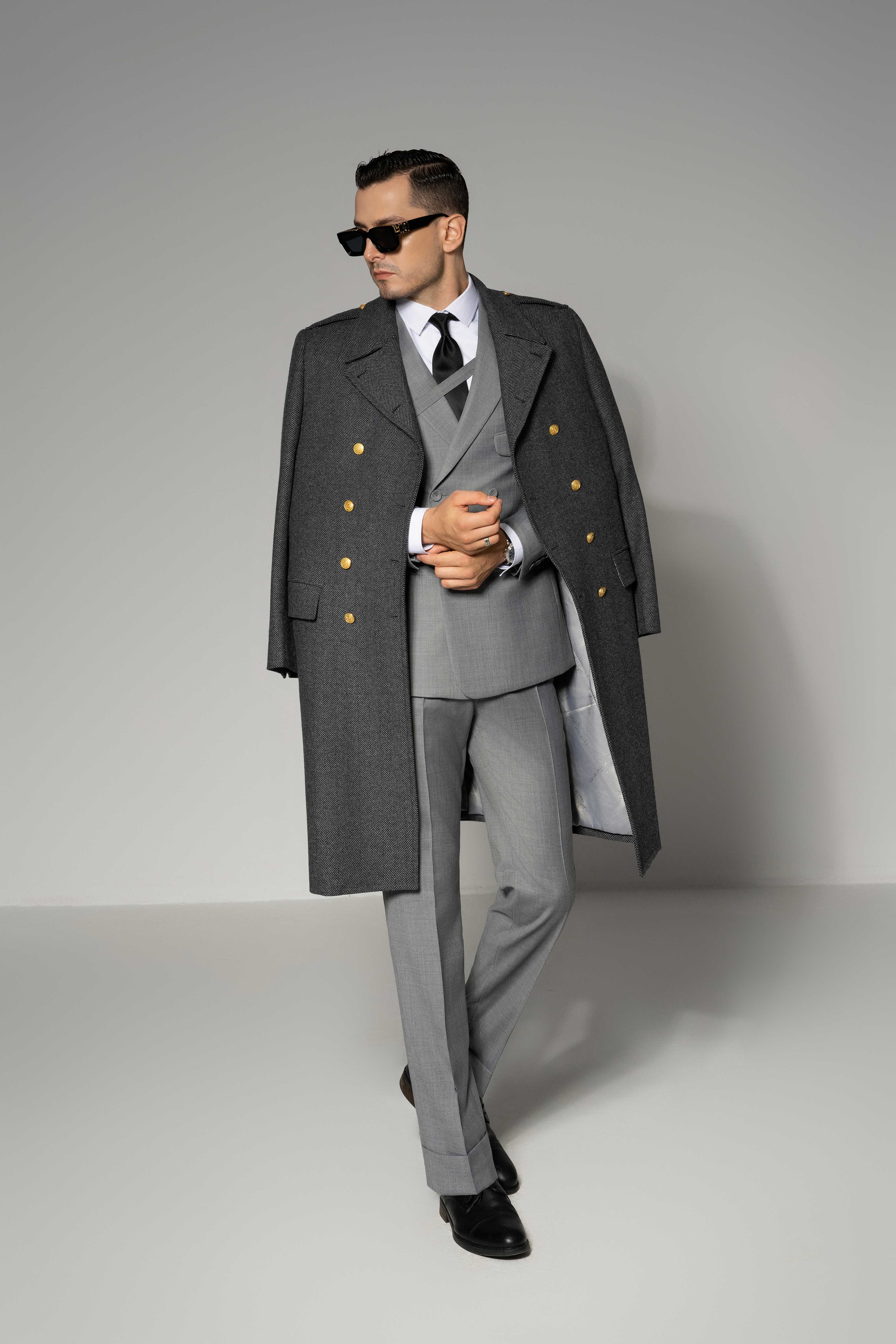 - Chi tiết: Chiếc áo choàng xám toát lên vẻ tinh tế và quyền lực. Thiết kế hai hàng khuy cùng những chiếc cúc vàng nổi bật mang lại cảm giác sang trọng. Phần vai áo cứng cáp và dáng may ôm tôn lên vóc dáng mạnh mẽ của người mặc. Áo được làm từ chất liệu len cao cấp, vừa giữ ấm vừa thanh lịch. Đây là món đồ hoàn hảo cho phong cách quý ông cổ điển và lịch lãm.