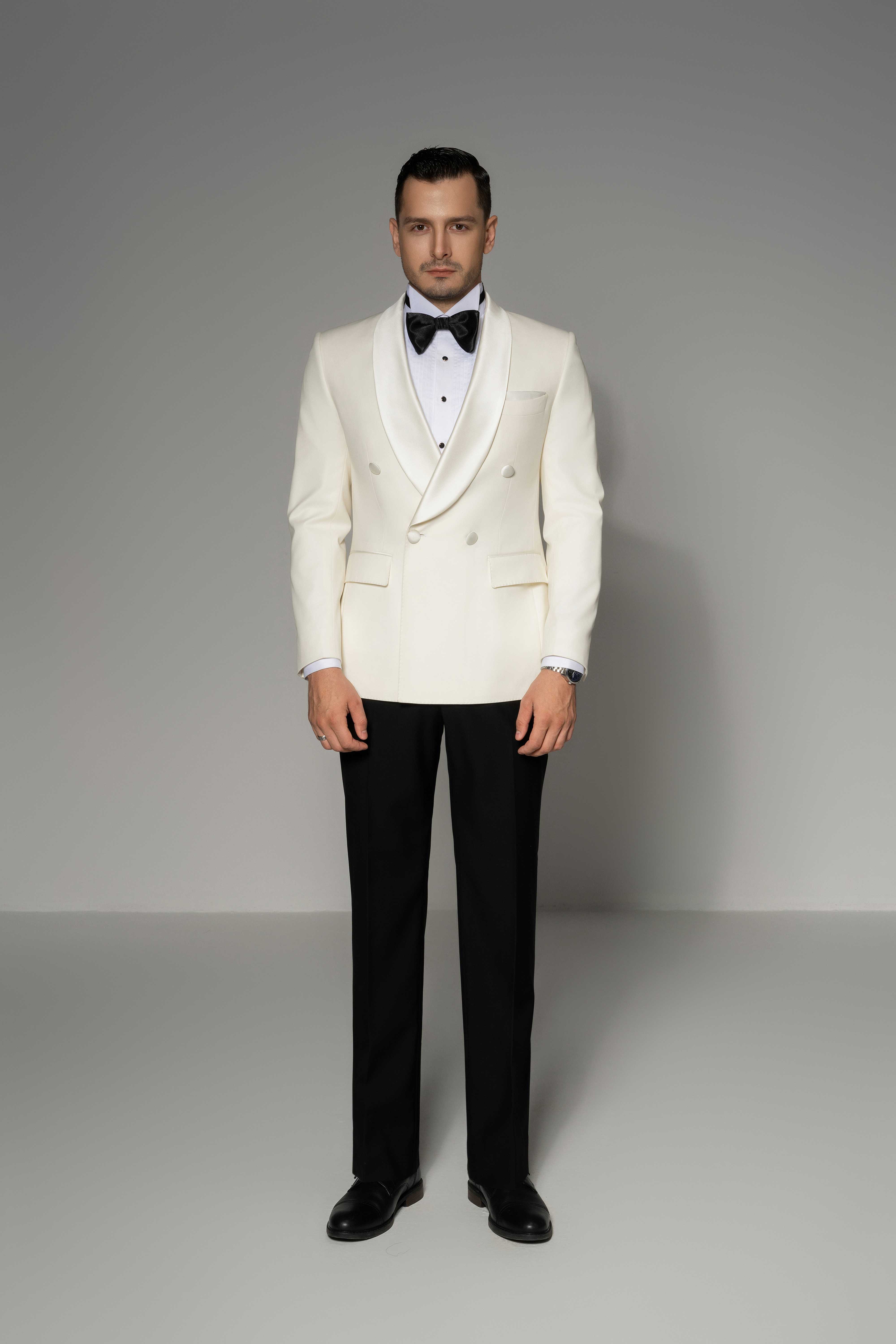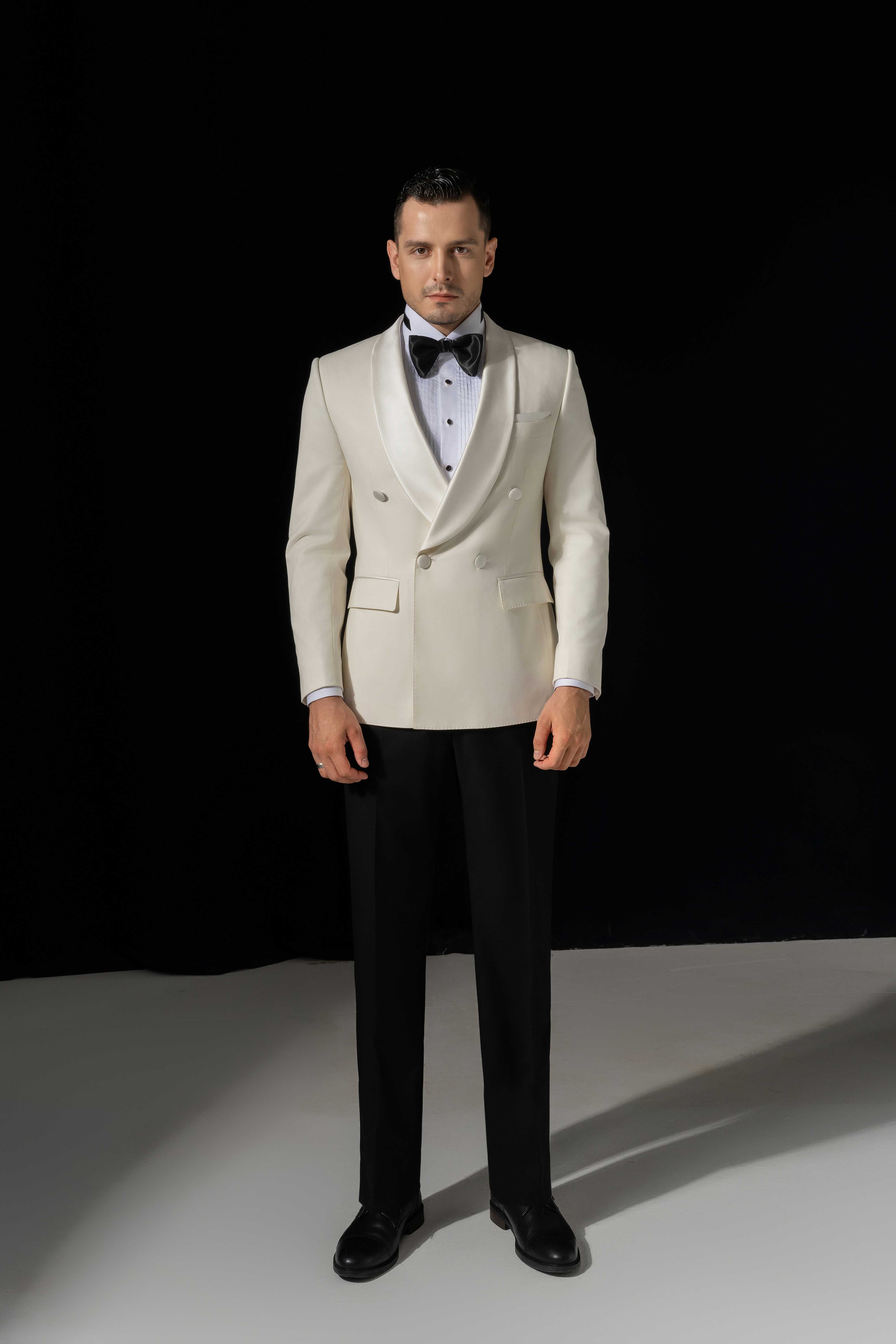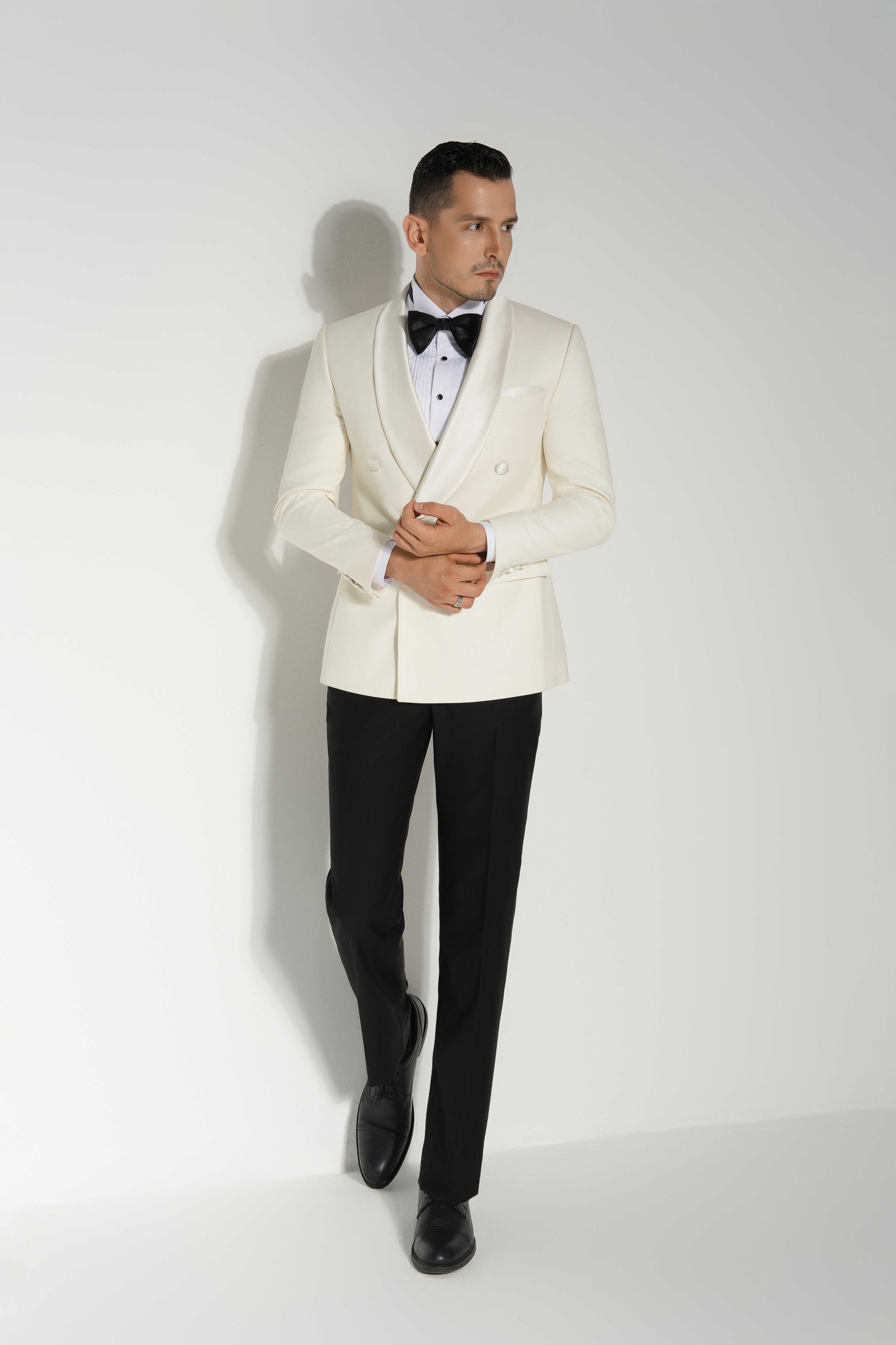 - Chi tiết: Bộ vest này mang phong cách cổ điển và sang trọng, rất phù hợp cho các sự kiện trang trọng như tiệc tối hay lễ cưới. Áo khoác trắng hai hàng cúc tạo nên vẻ lịch lãm và nổi bật, trong khi chiếc nơ đen cùng áo sơ mi trắng làm tôn lên sự tương phản tinh tế. Phần quần âu đen giúp cân bằng tổng thể, mang lại cảm giác chỉn chu và nam tính. Cuối cùng, đôi giày da đen hoàn thiện trang phục, nhấn mạnh phong thái quý ông hiện đại đầy tự tin và cuốn hút.