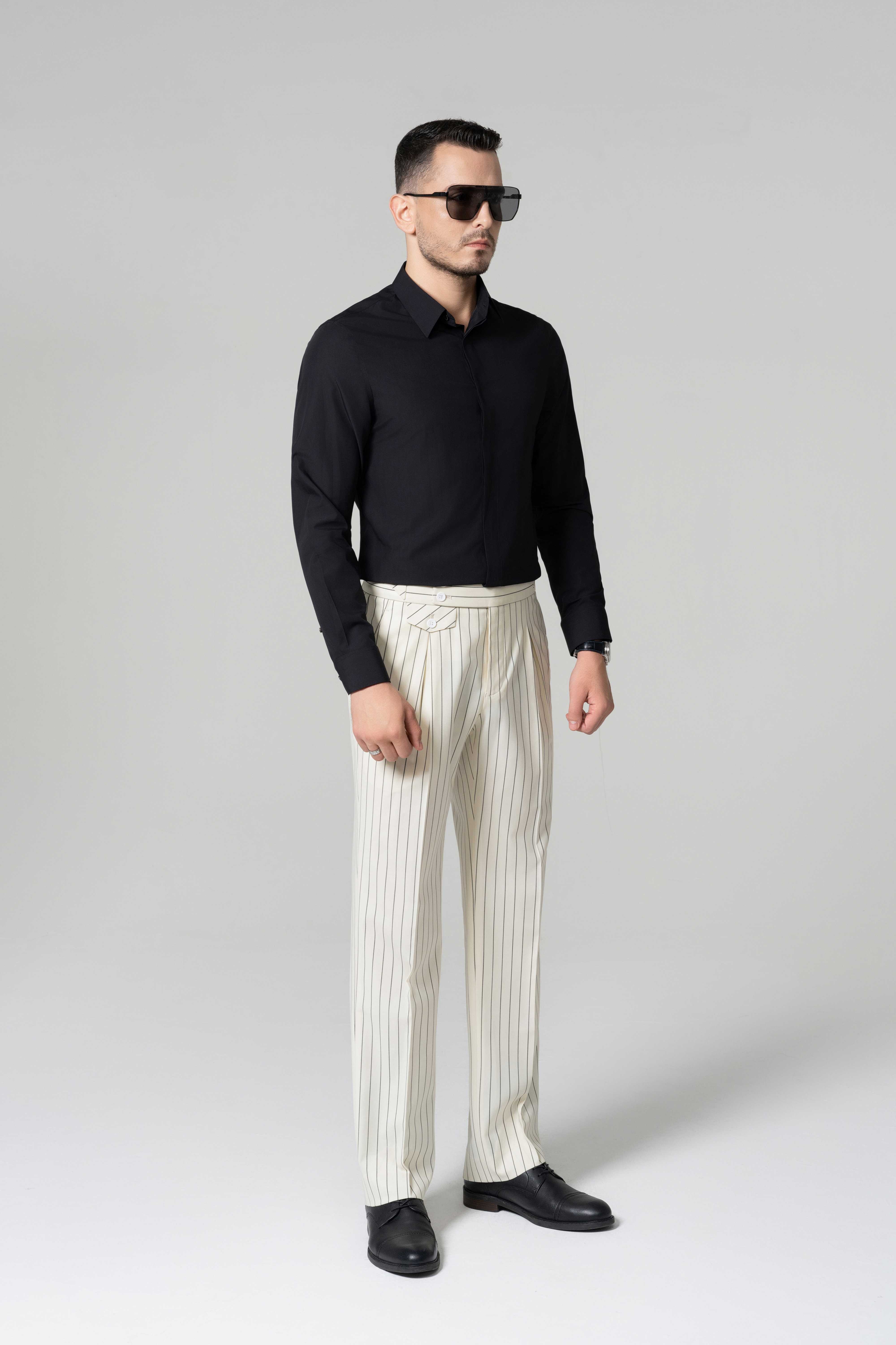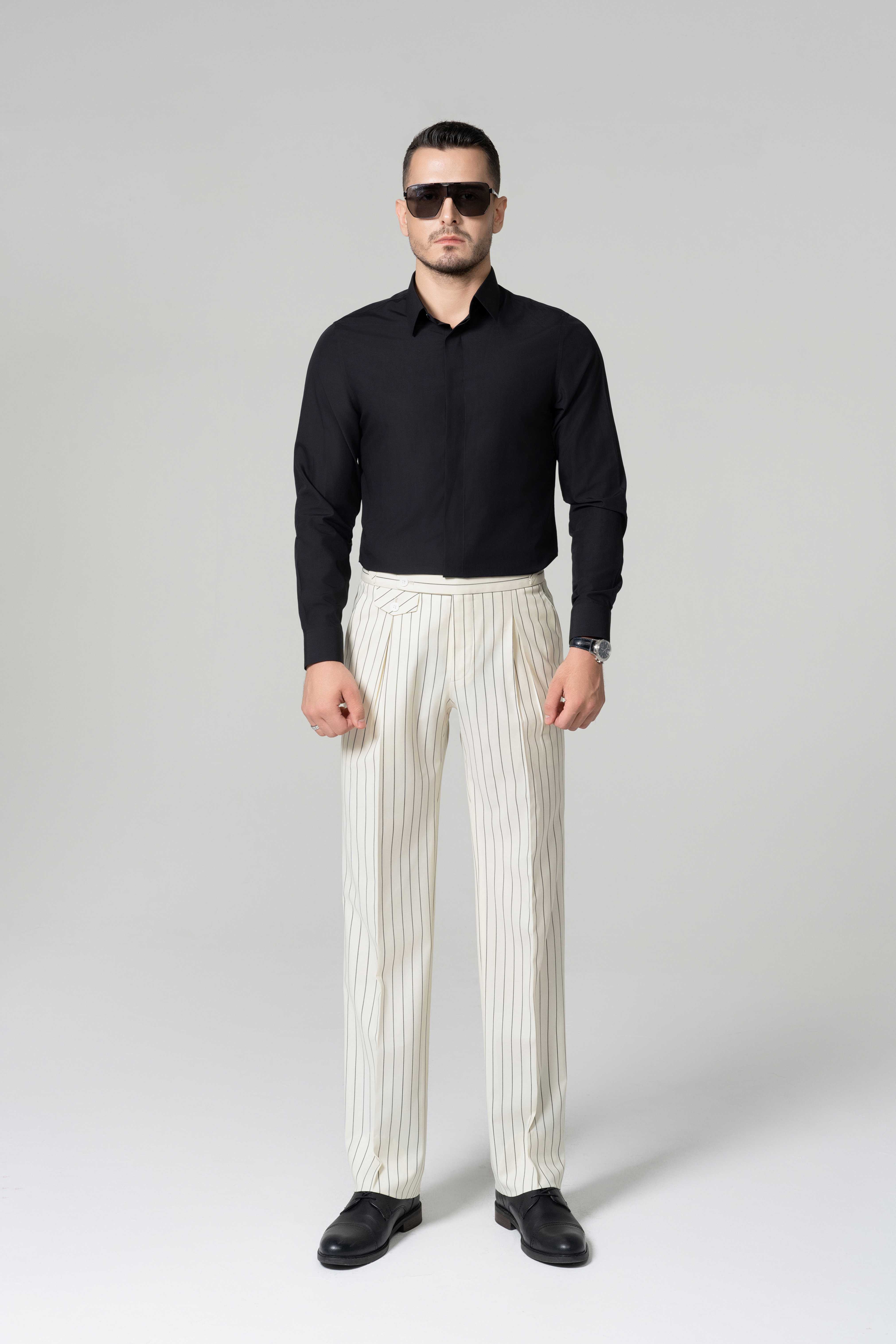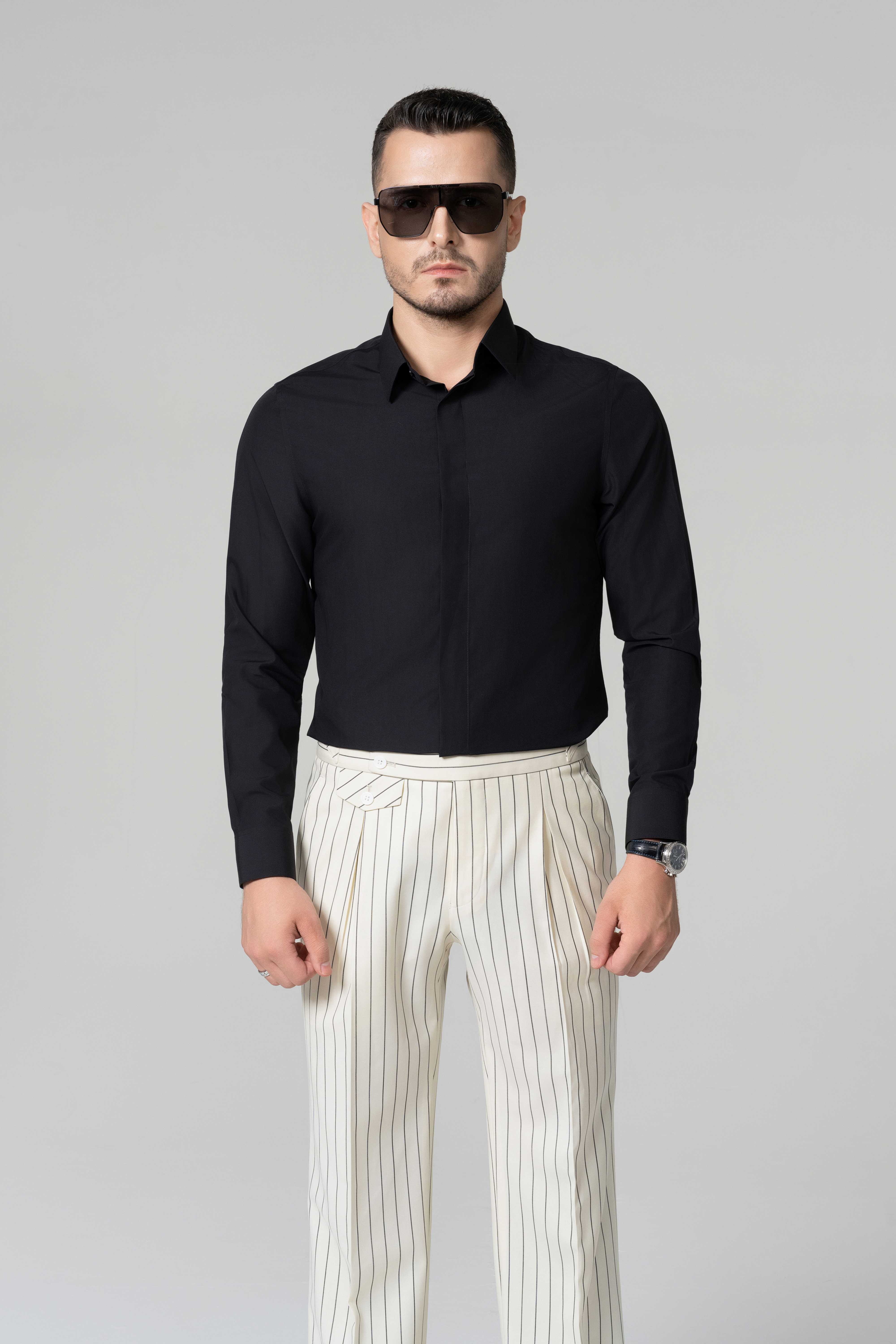 - Chi tiết: Chiếc áo sơ mi màu đen toát lên vẻ sang trọng và tự tin nhờ thiết kế tối giản và tinh tế. Chất vải mịn và phom dáng ôm vừa vặn giúp tôn lên đường nét nam tính của người mặc. Đường cắt gọn gàng cùng cổ áo cổ điển mang đến sự thanh lịch vượt thời gian, phù hợp cho cả phong cách trang trọng lẫn bán trang trọng. Gam màu đen làm tăng vẻ mạnh mẽ và quý phái, tạo ấn tượng sâu sắc. Khi kết hợp cùng quần sọc trắng, tổng thể trở nên ấn tượng, thời thượng và đầy cuốn hút.