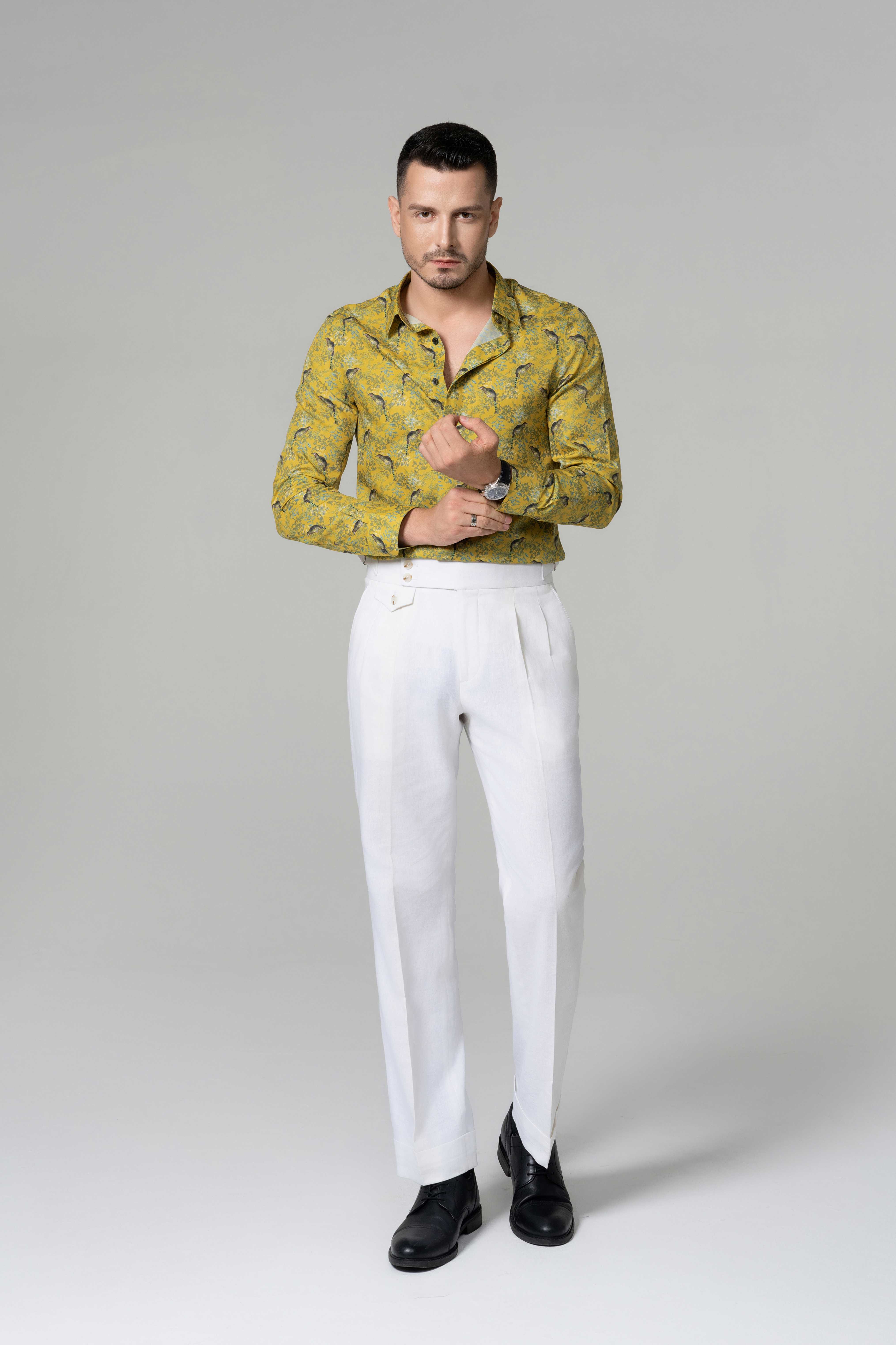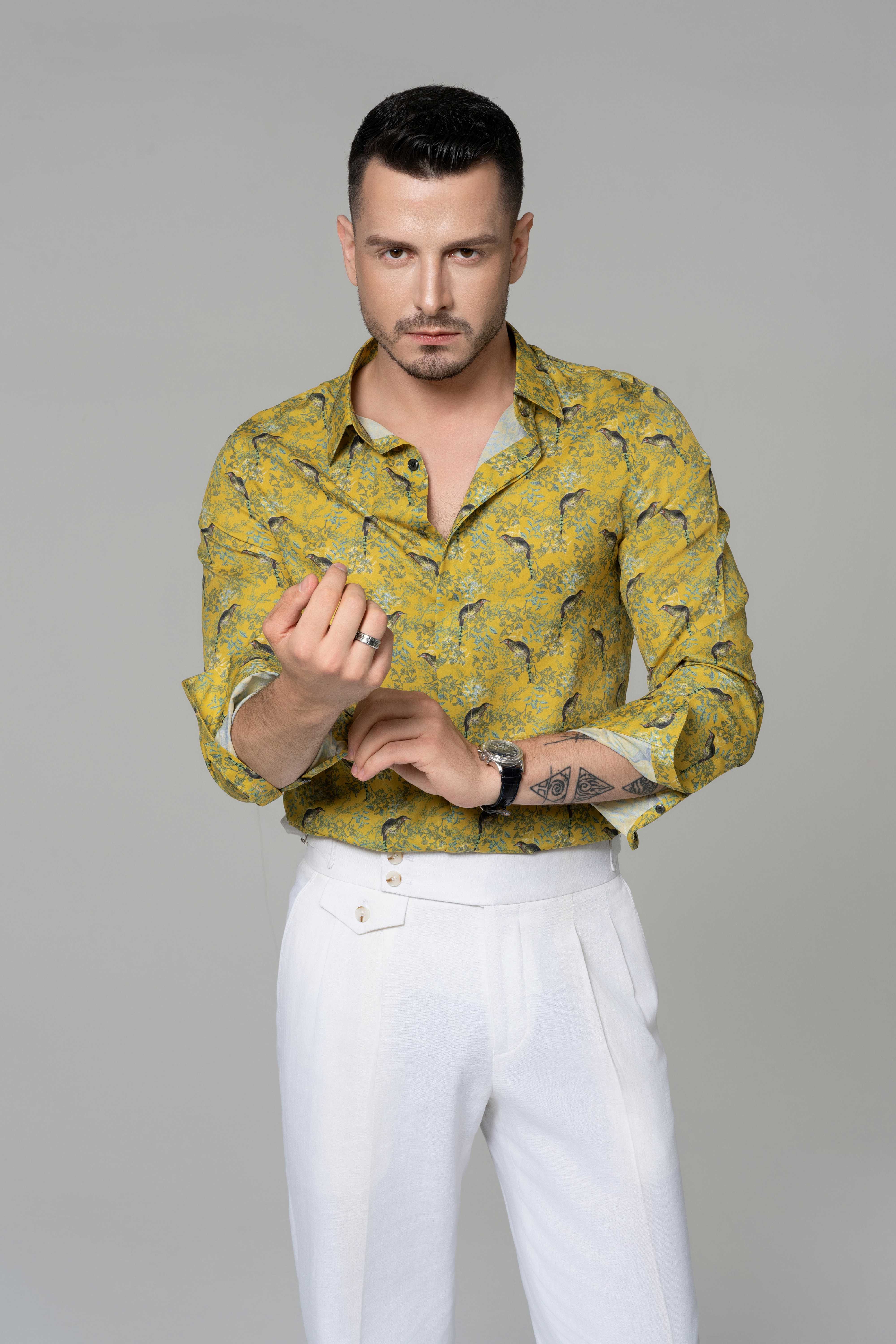 - Chi tiết: Chiếc áo sơ mi họa tiết màu vàng nổi bật với thiết kế táo bạo và nghệ thuật. Áo có hoa văn tinh tế pha trộn giữa các tông xanh và xám, tạo nên vẻ ngoài sống động và thời trang. Chất vải nhẹ cùng cổ áo mở mang đến cảm giác thoải mái và phong thái hiện đại. Tay áo được xắn lên giúp người mặc trông phóng khoáng và tự tin hơn. Khi kết hợp cùng quần trắng, bộ trang phục trở nên tươi sáng, nổi bật và đầy sức sống cho mùa hè.
