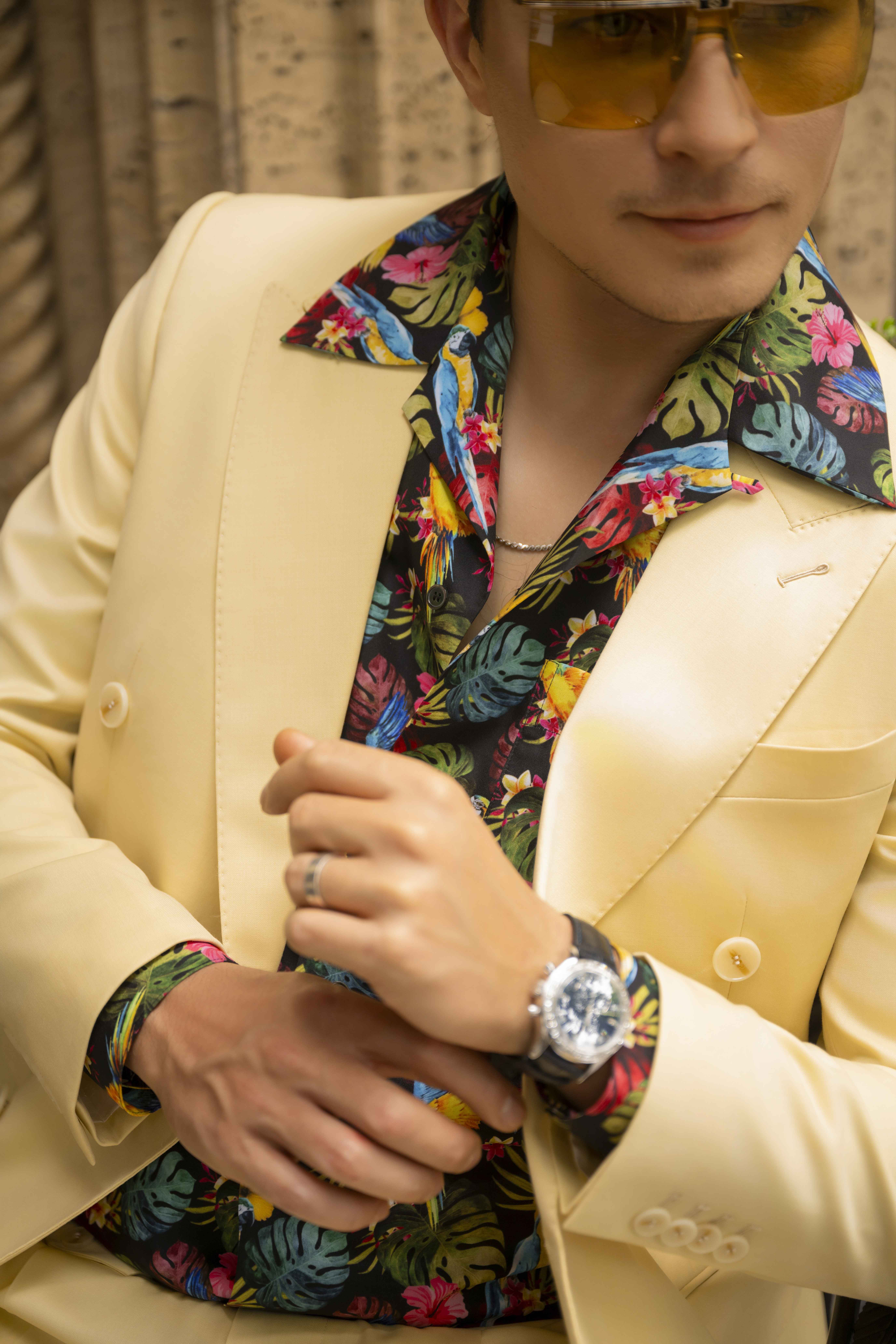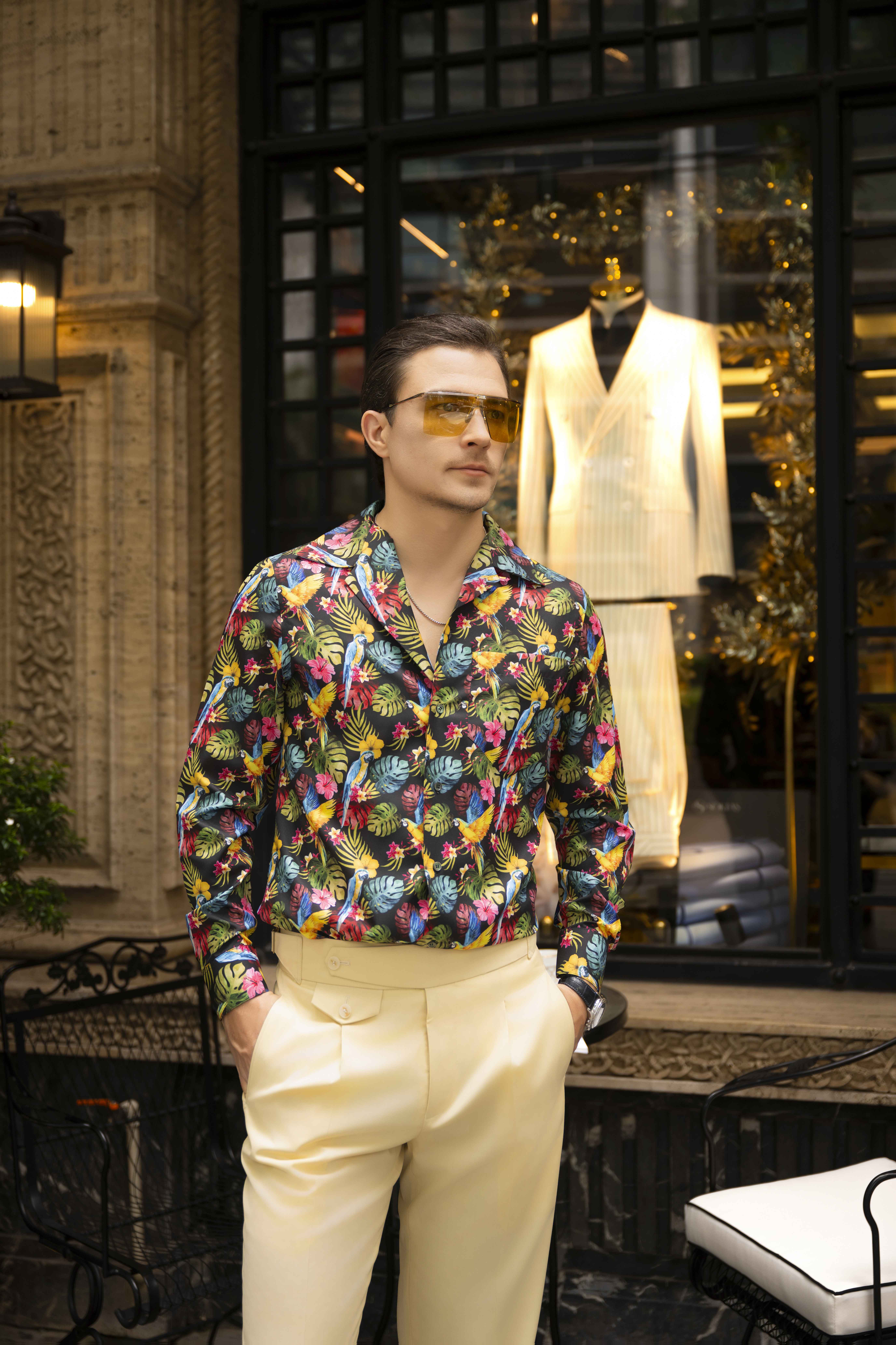 - Chi tiết: Chiếc áo sơ mi họa tiết nhiệt đới tràn đầy sắc màu và năng lượng, rất phù hợp cho những ngày hè sôi động. Áo có họa tiết lá nhiệt đới và chim vẹt rực rỡ, tạo nên phong cách nổi bật và vui tươi. Chất liệu vải nhẹ, mịn và bóng mang lại sự thoải mái nhưng vẫn sang trọng. Thiết kế cổ mở giúp người mặc trông phóng khoáng và thời thượng, lý tưởng cho các trang phục dạo phố hoặc du lịch. Khi kết hợp cùng quần màu be sáng, tổng thể trở nên lôi cuốn, tự tin và đầy phong cách.